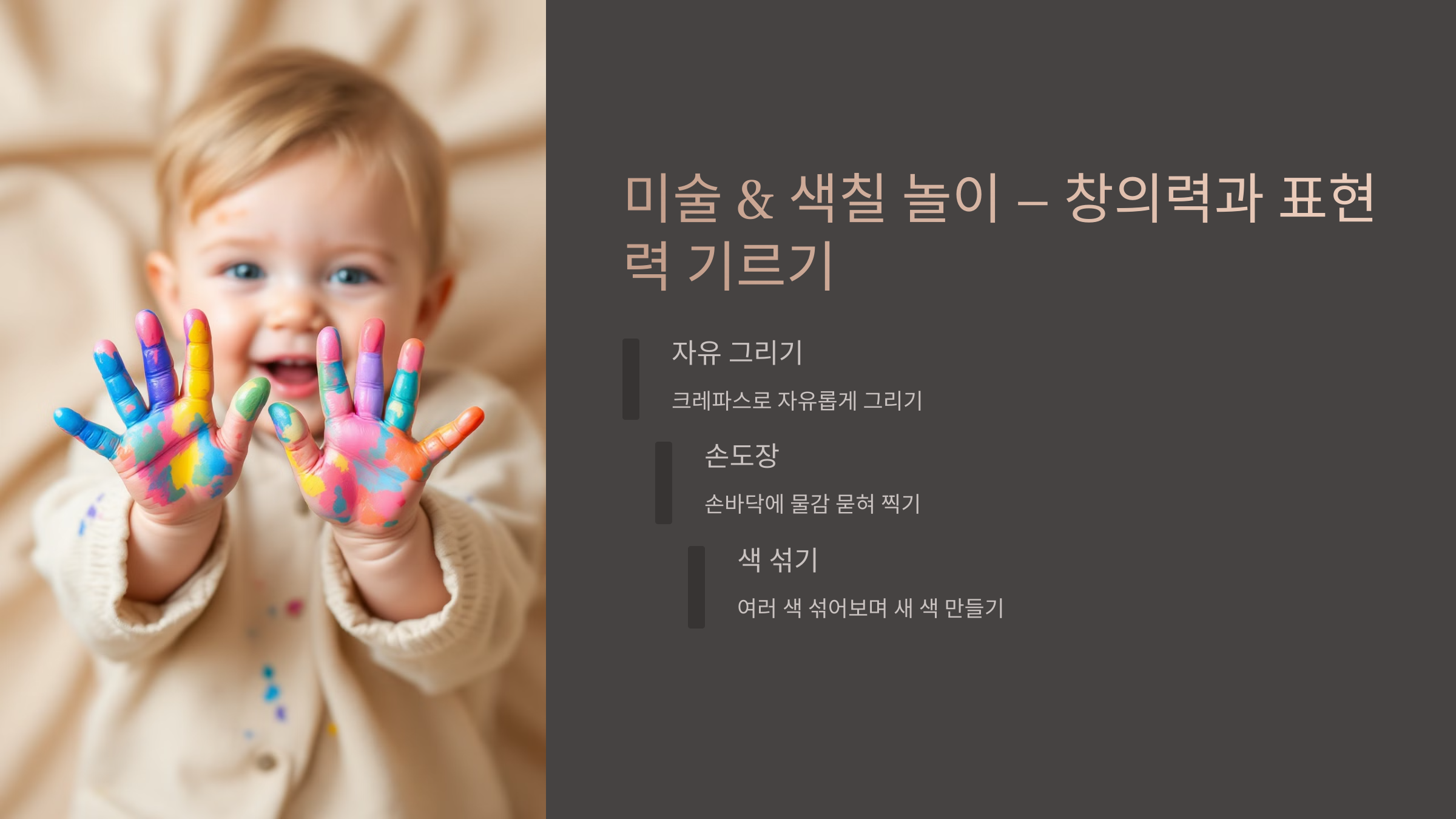 아기들이 손으로 그림을 그리고 색칠하는 과정에서 창의력이 발달해요. 색을 고르고 칠하는 과정에서 선택 능력도 길러진답니다.