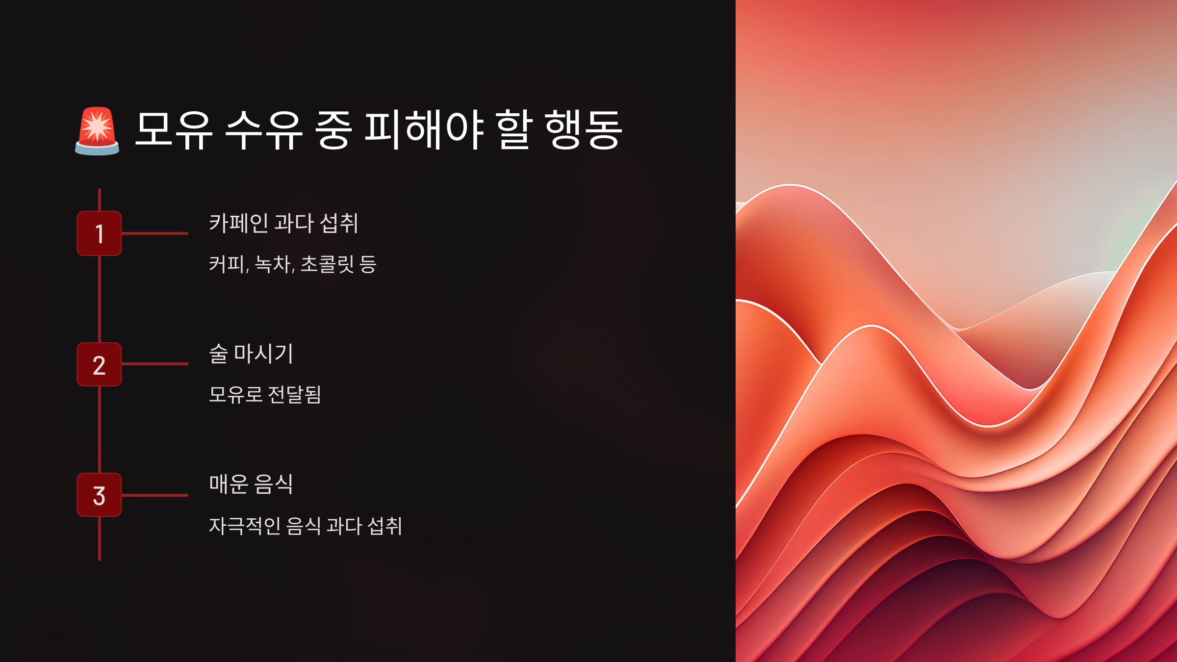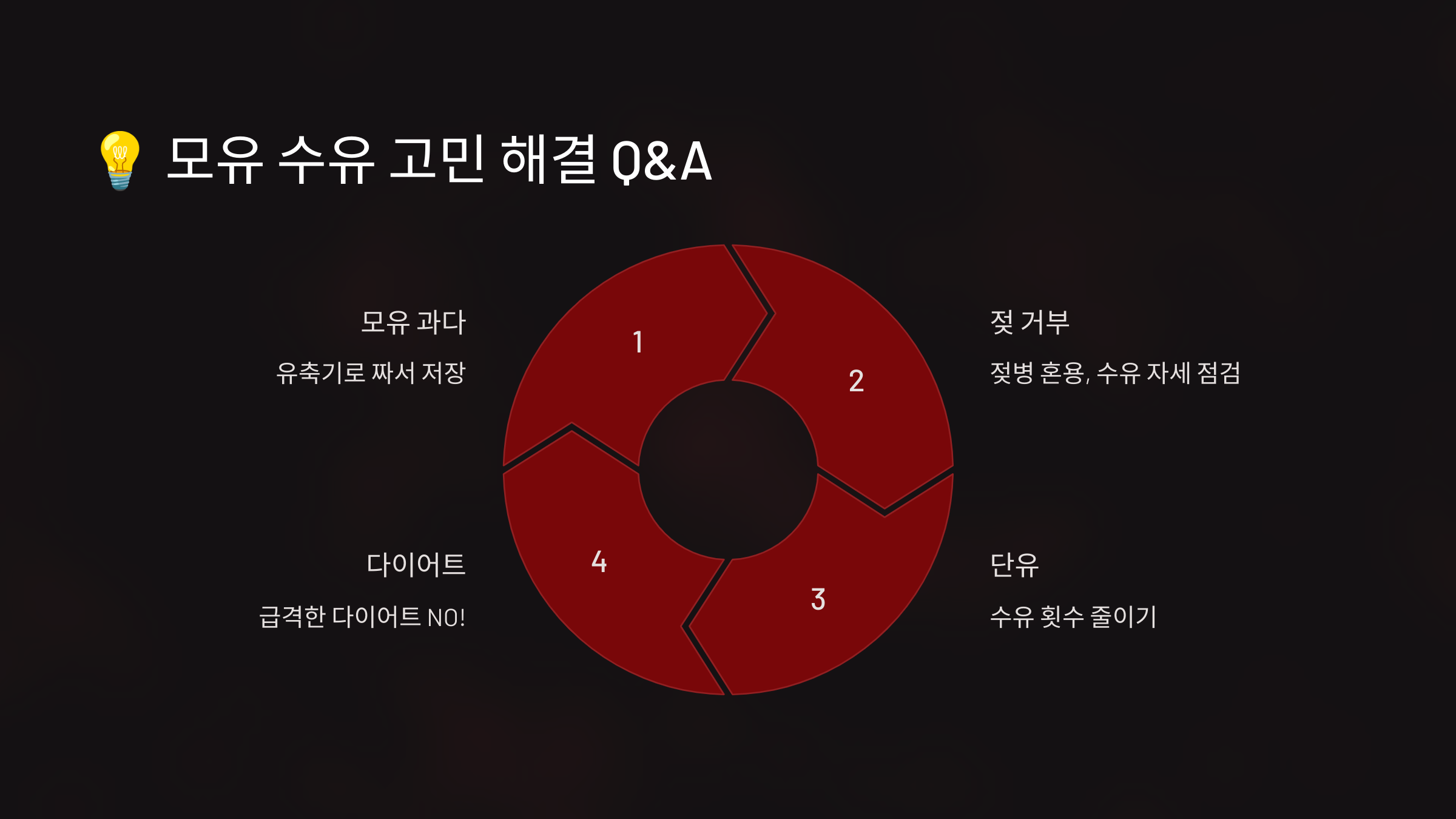 ➡️ 점진적으로 수유 횟수를 줄이고, 유방 마사지를 병행하세요.