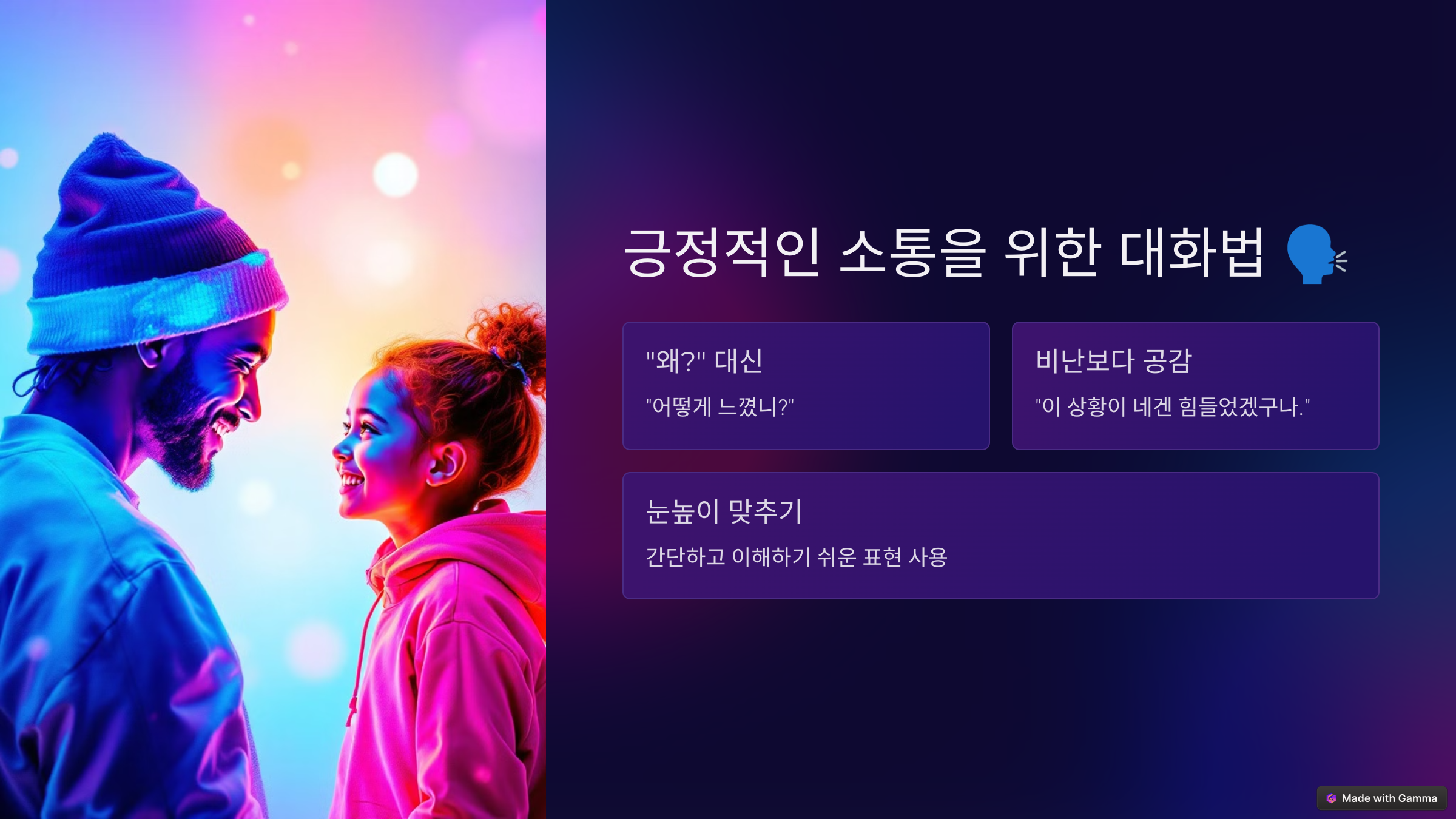 - 비난보다는 공감: "넌 왜 이렇게 말을 안 들어!" 대신 "이 상황이 네겐 힘들었겠구나."