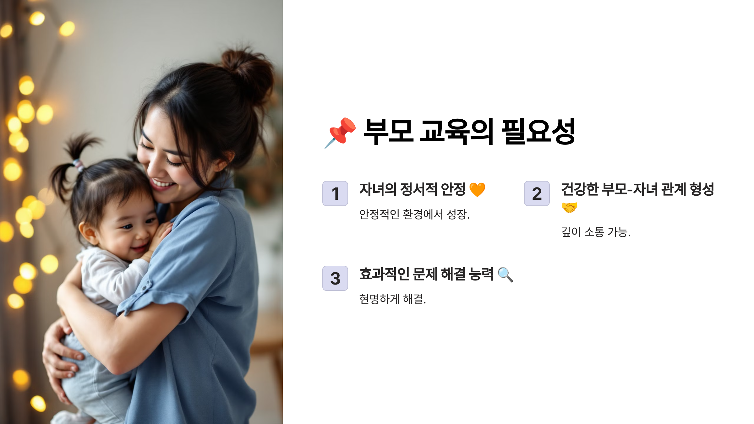 부모가 올바른 양육 태도를 갖추면, 아이는 안정적인 환경에서 자라요. - 건강한 부모-자녀 관계 형성 🤝
