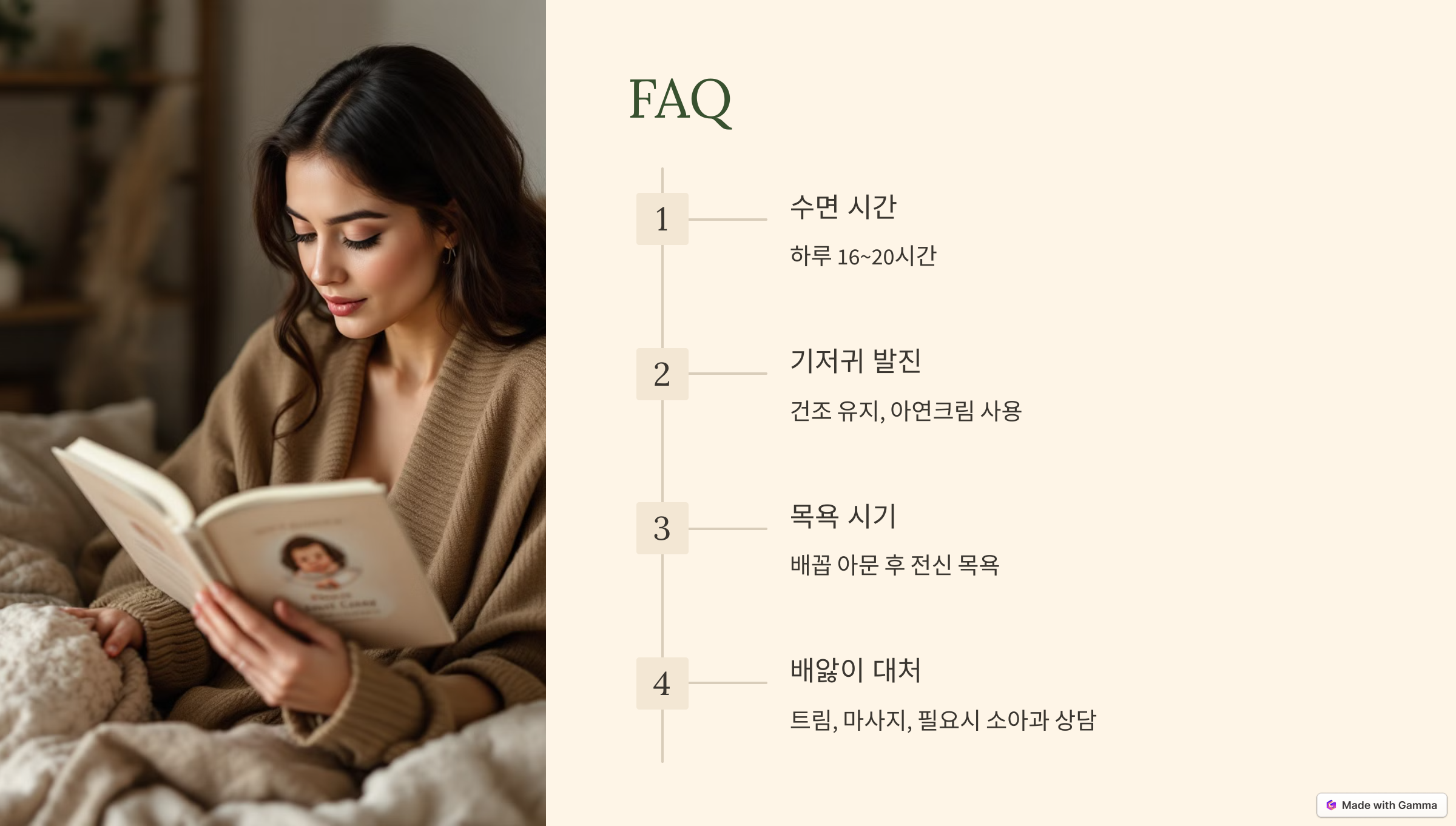 - 수면 루틴을 만들어 주세요. (예: 저녁 목욕 → 수유 → 조용한 환경)