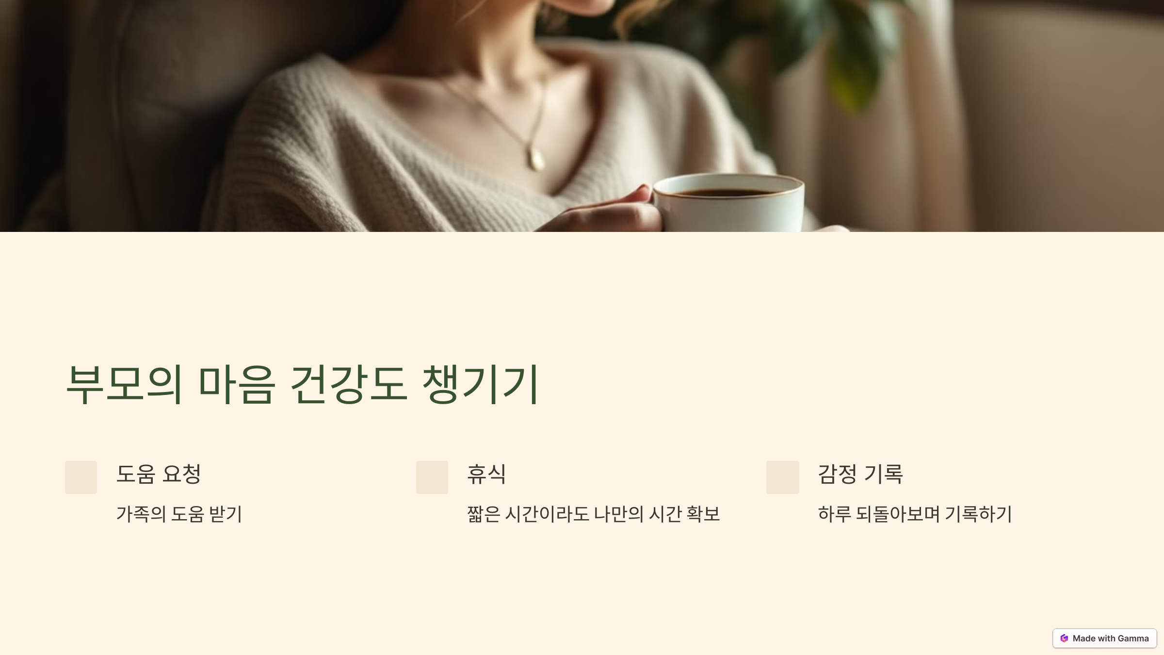 - 짧은 시간이라도 나만의 시간을 확보하세요. 산책이나 커피 한 잔의 여유가 큰 힘이 될 수 있습니다.
