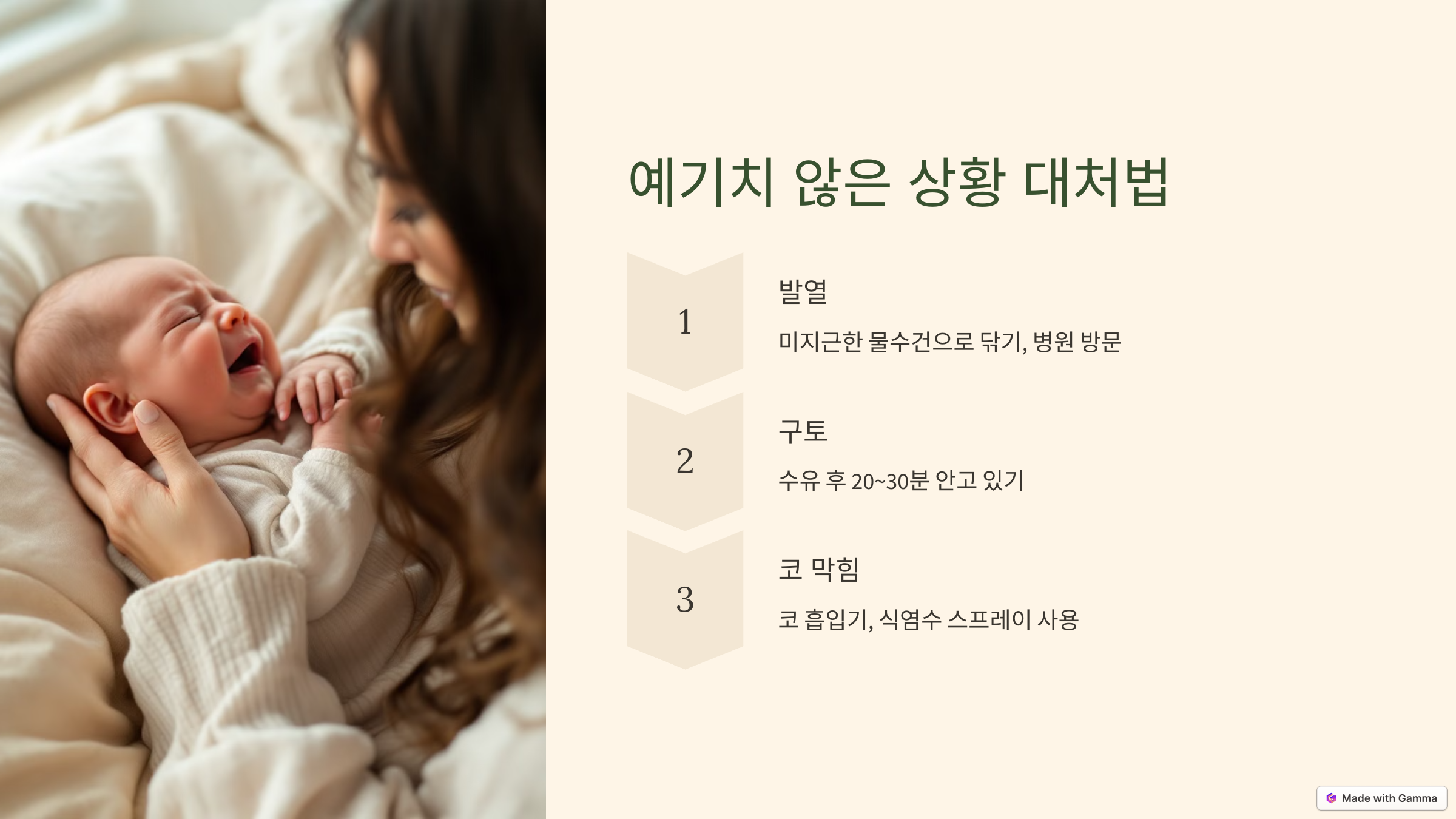 신생아를 돌보다 보면 갑작스러운 상황에 당황할 수 있어요. 미리 대처법을 알아두면 훨씬 안심할 수 있습니다.
