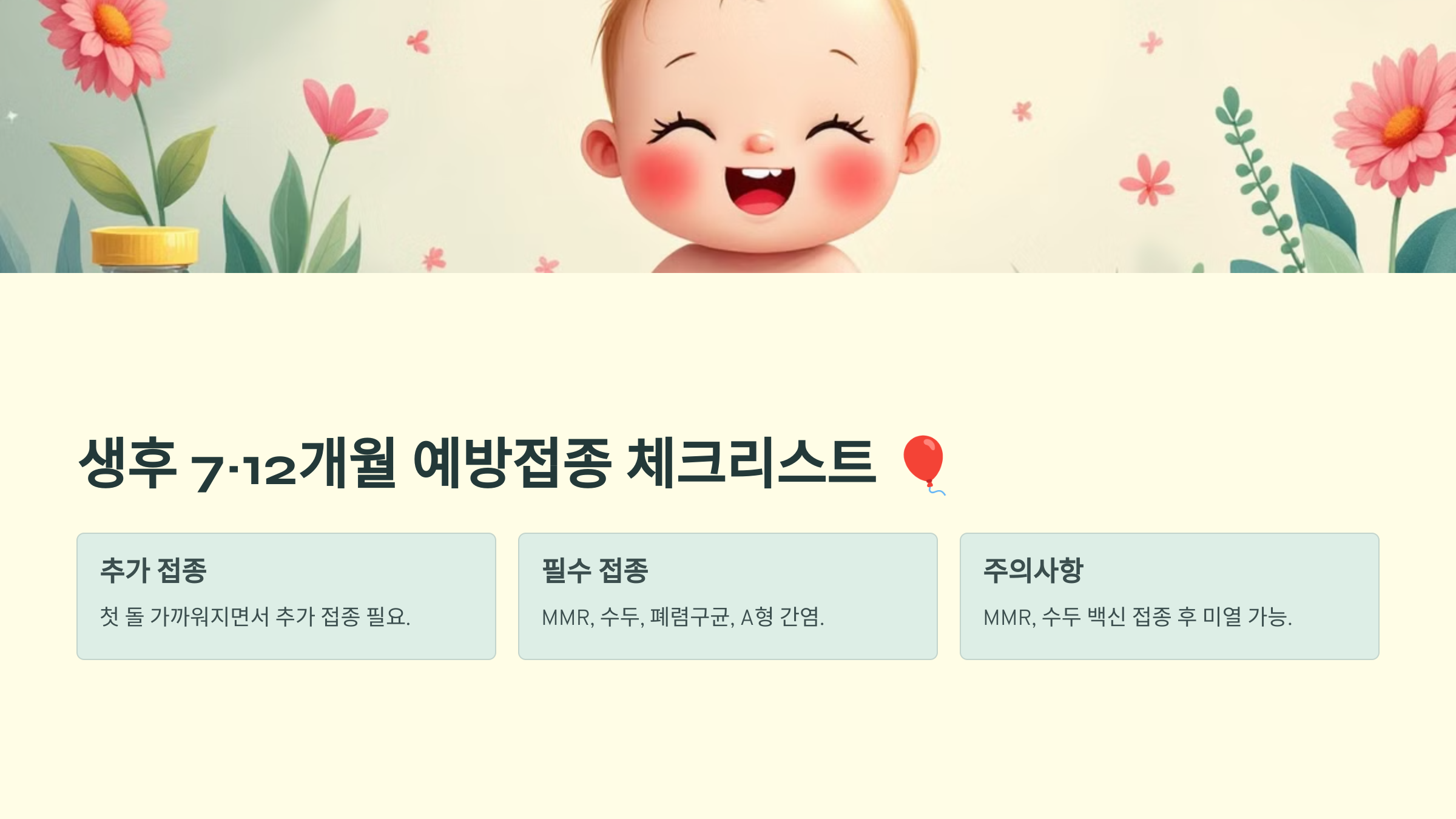 | 12개월 | MMR(홍역, 유행성이하선염, 풍진) 1차, 수두, 폐렴구균 4차, A형 간염 1차 |