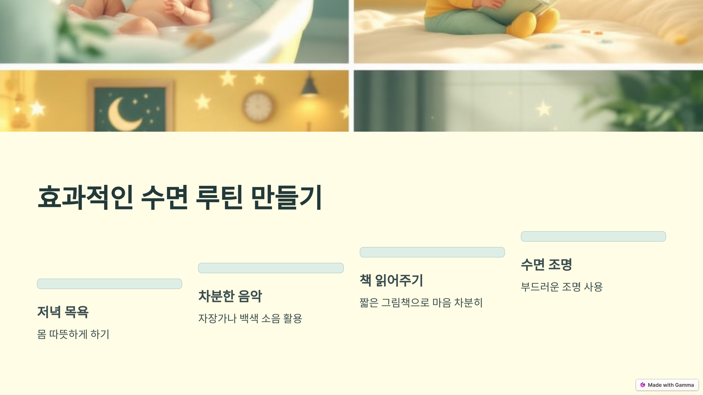 일관된 수면 루틴은 아기에게 심리적 안정감을 줍니다. 수면 루틴을 통해 잠들기 전 신호를 만들어 주세요.
