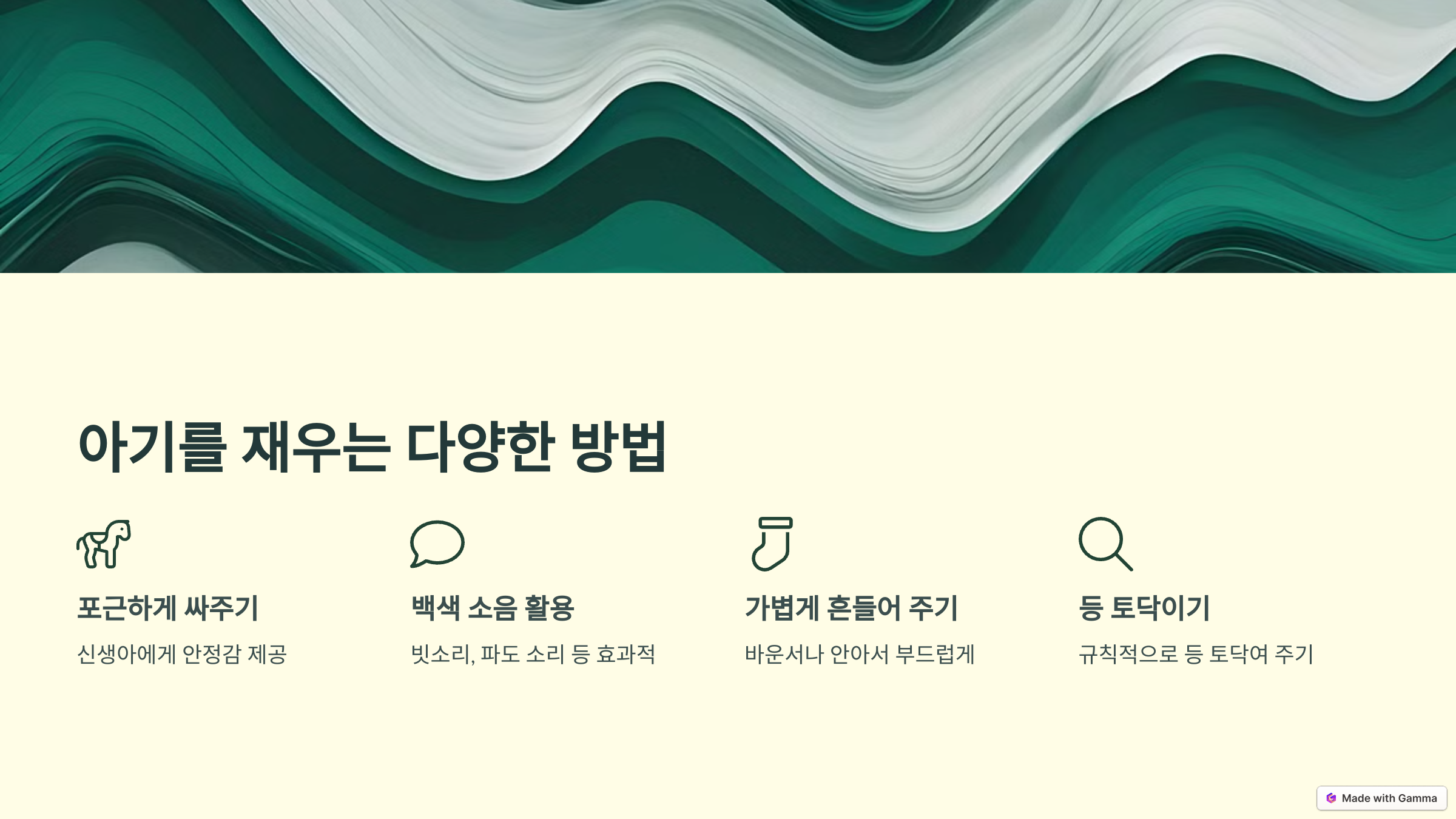 - 백색 소음 활용하기: 빗소리, 파도 소리, 심장 소리 등이 효과적입니다.