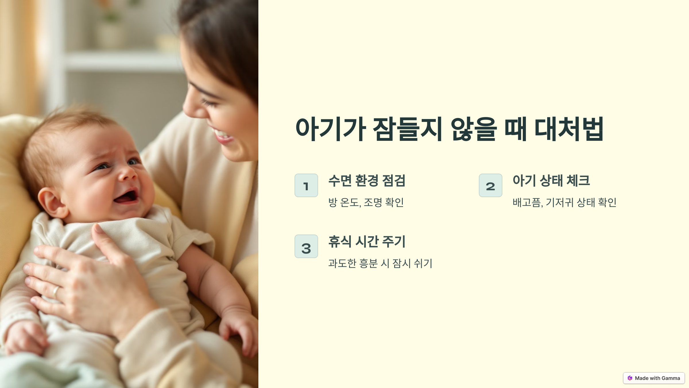 아기가 잠투정을 하거나 잠들지 않을 때는 정말 난감하죠. 이럴 때는 잠시 대처법을 활용해 보세요.