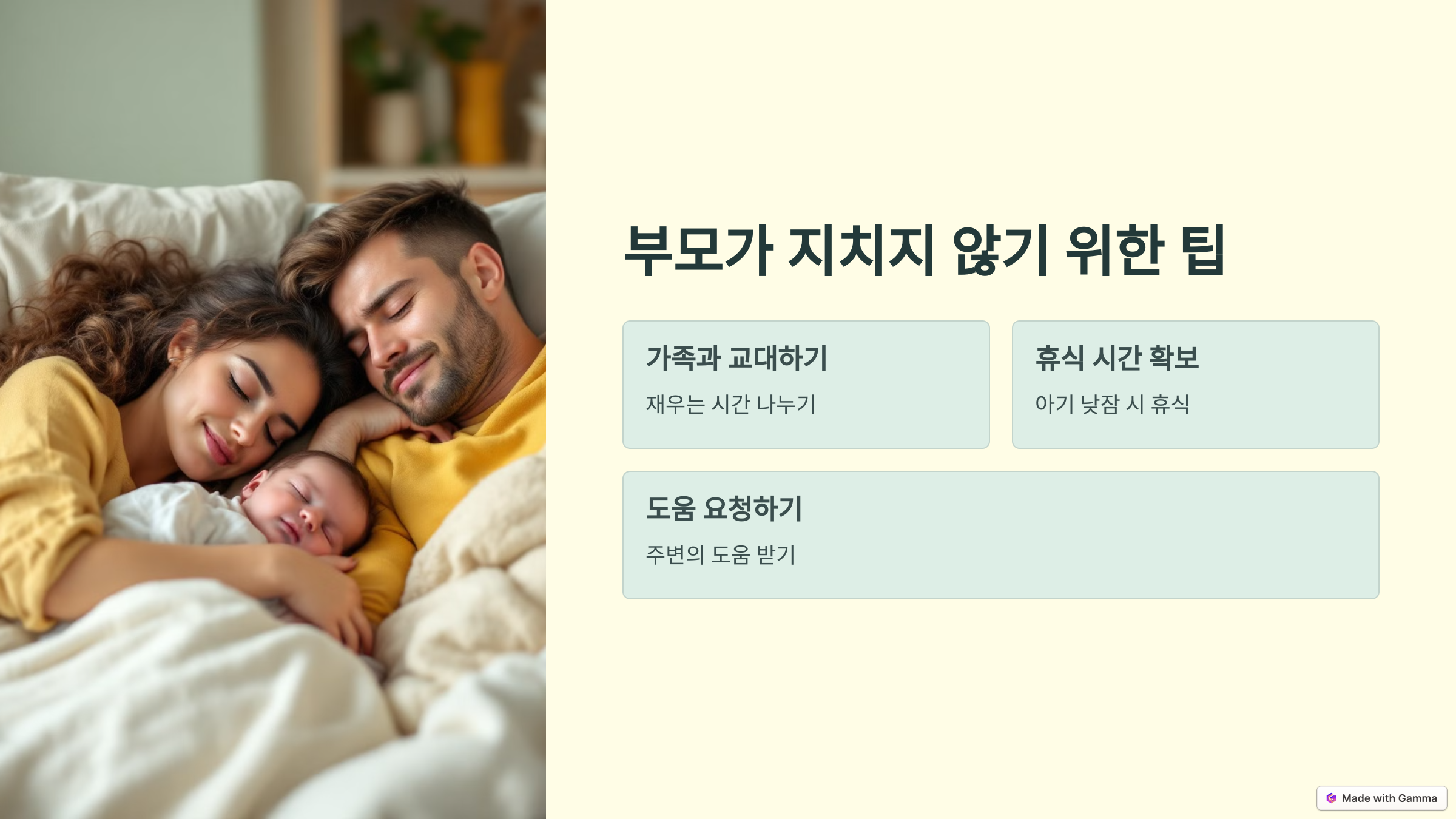 - 잠깐의 휴식 시간 확보: 아기가 낮잠을 잘 때 부모도 짧게나마 쉬는 것이 중요해요.