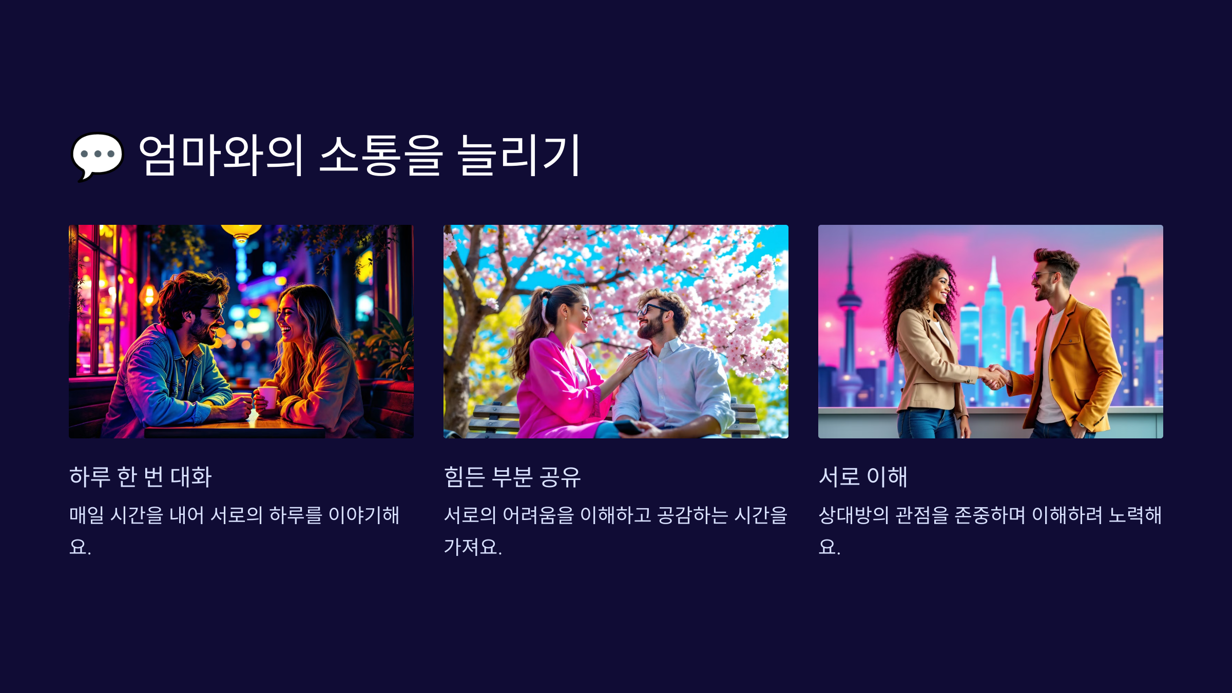 아빠들이 육아에서 소외되는 이유 중 하나가 바로 소통 부족이에요. 엄마와 육아 관련 대화를 자주 하면 어떤 부분을 도와야 할지 자연스럽게 알게 됩니다.