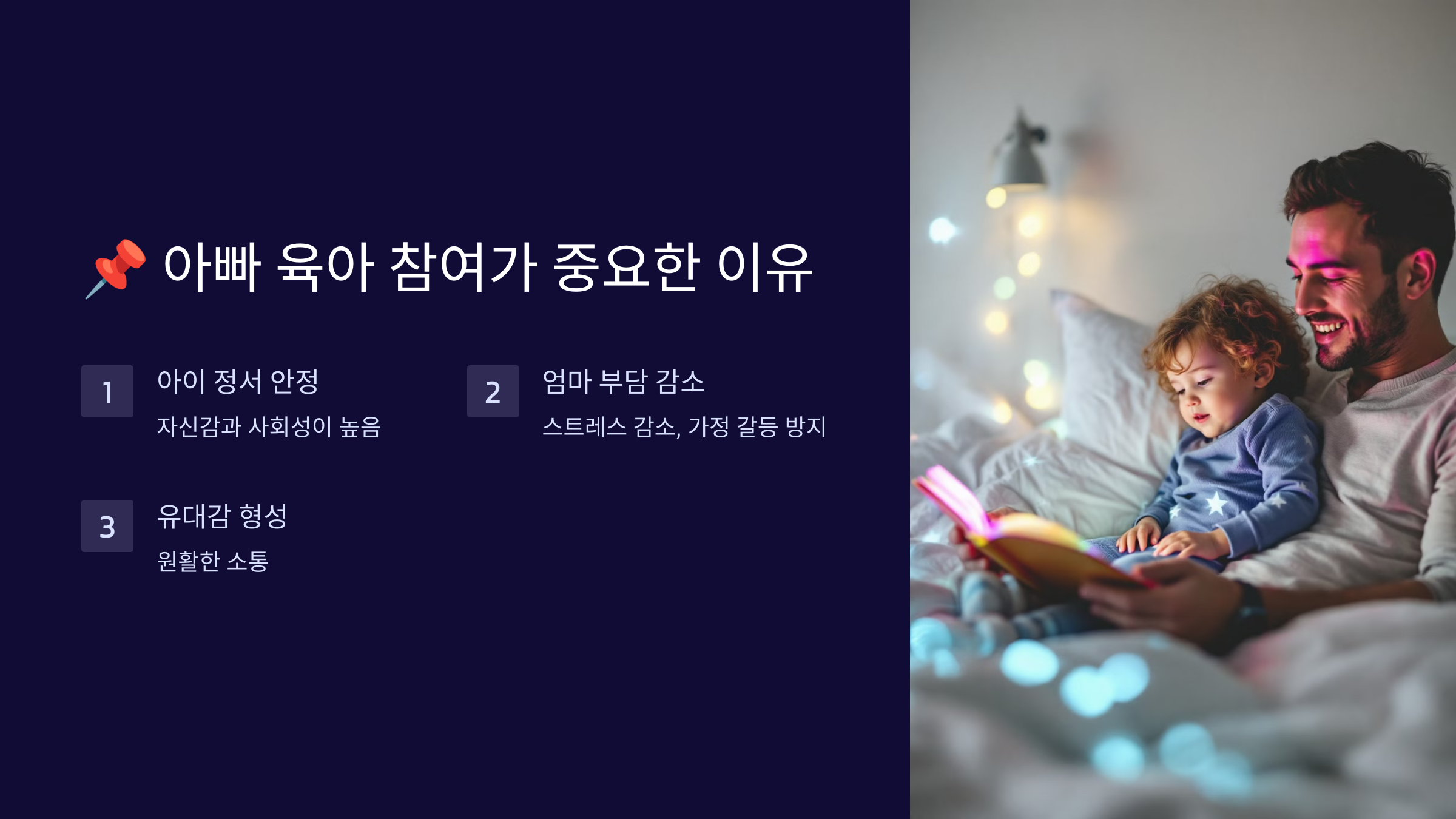 엄마 혼자 모든 육아를 책임지면 스트레스가 심해지고, 가정 내 갈등도 늘어날 수 있어요. - 아빠와 아이의 유대감 형성 🤝