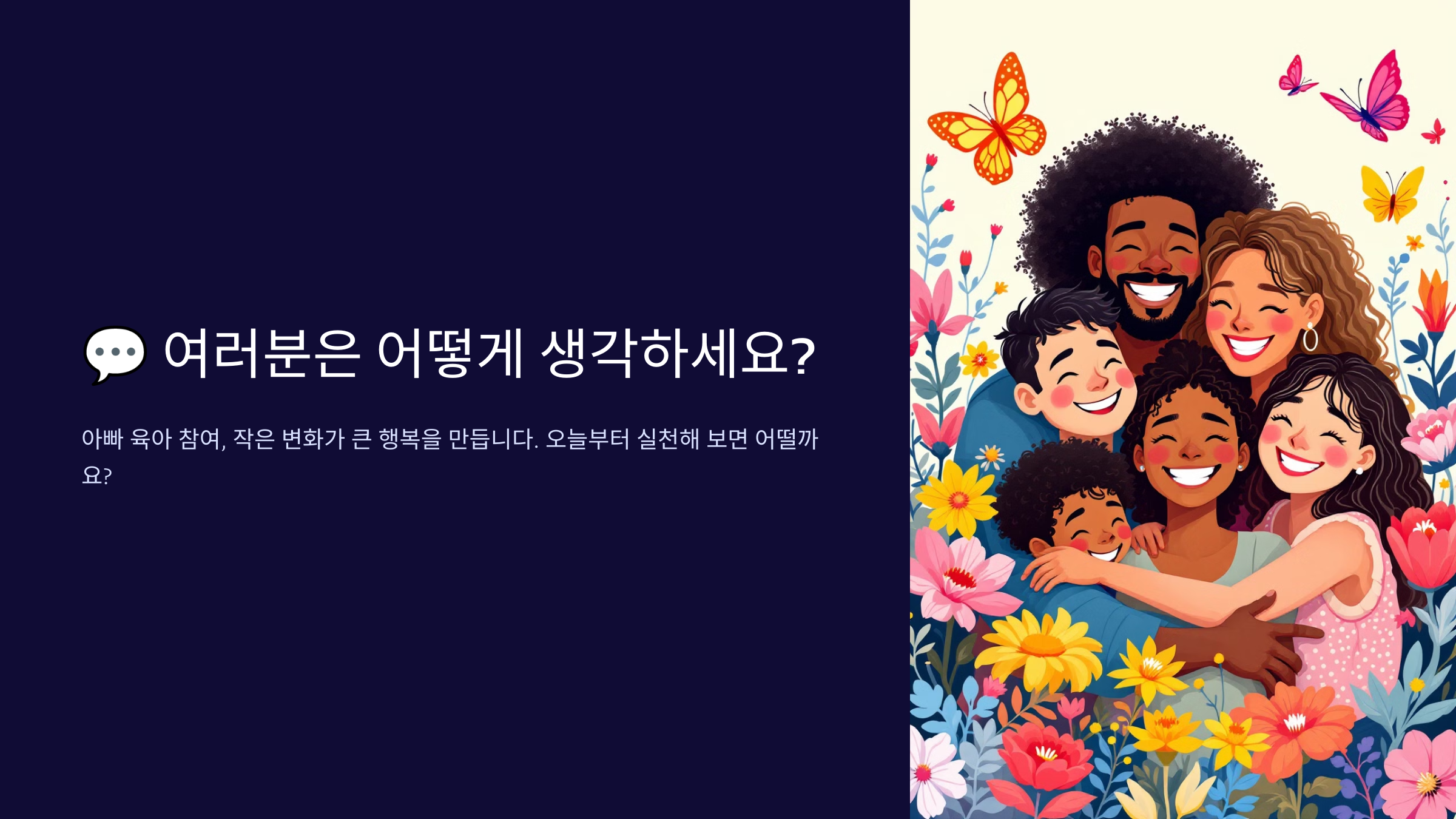 여러분의 가정에서는 아빠 육아 참여가 어느 정도인가요? 혹시 좋은 방법이 있다면 공유해 주세요! 💡