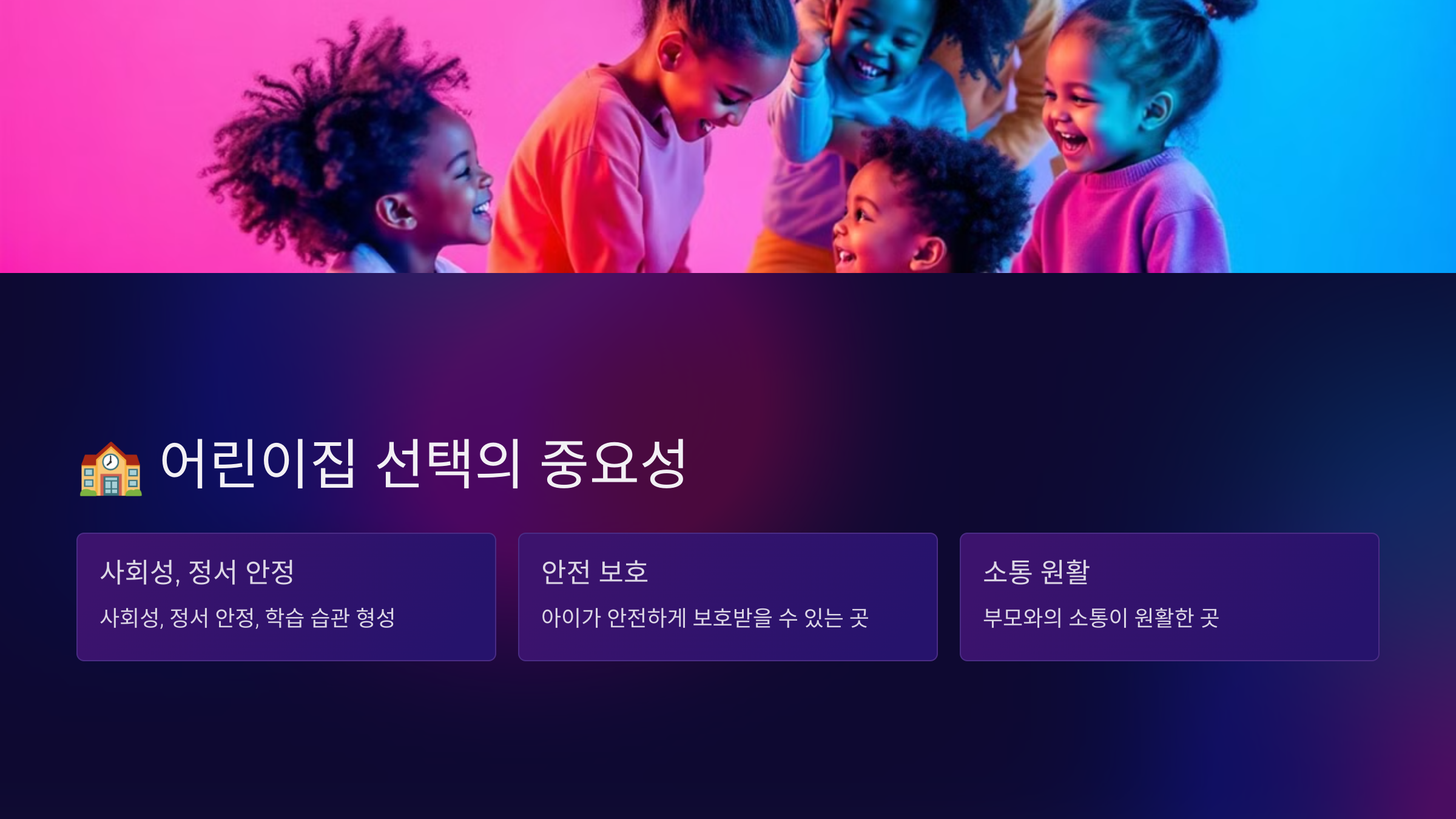 어린이집은 단순히 아이를 맡기는 곳이 아니라 사회성, 정서 안정, 학습 습관이 형성되는 곳이에요.