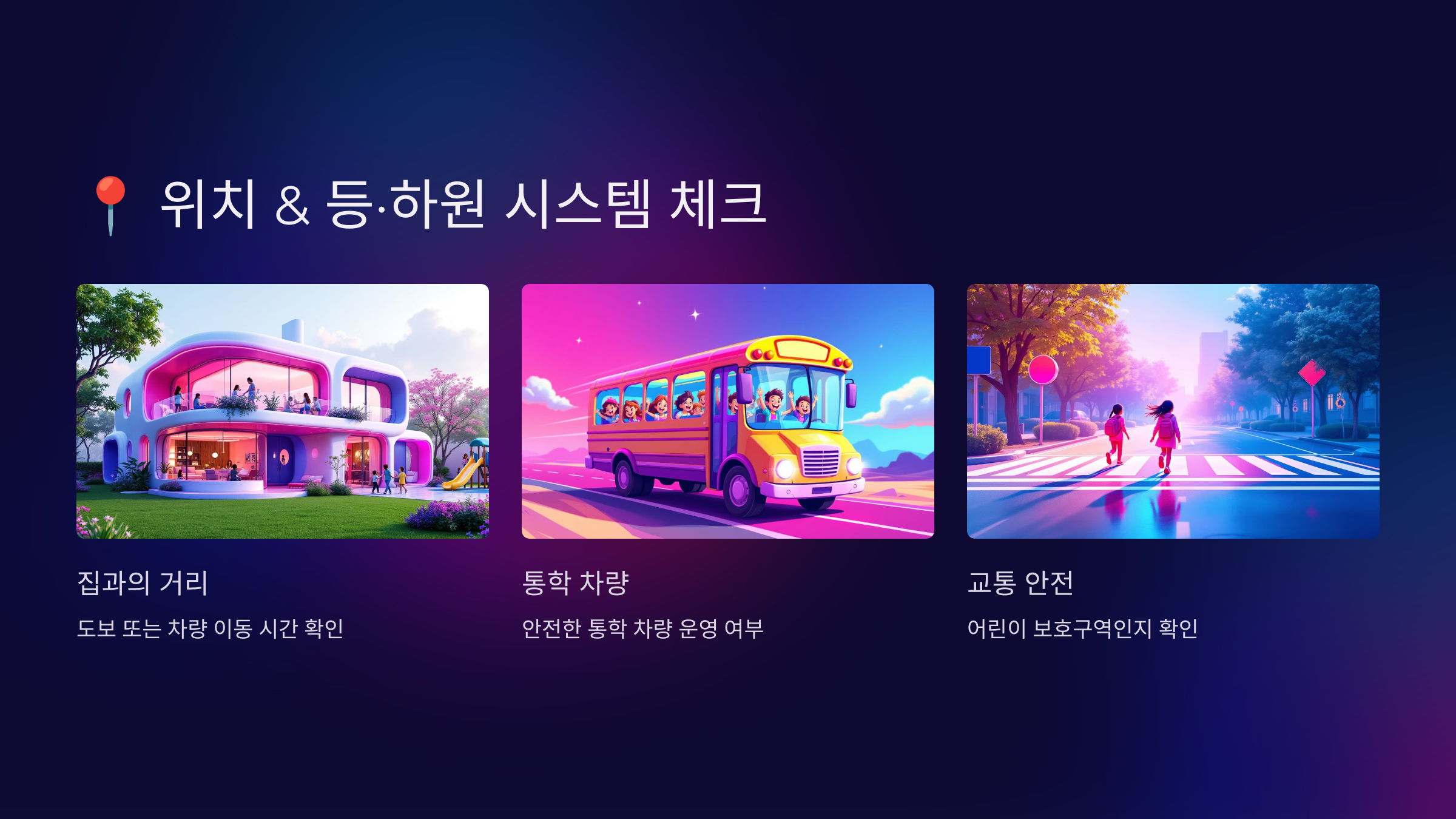 ✔ 통학 차량 이용 시: 운행 노선과 안전 장치(안전벨트, 동승 교사 유무) 확인
