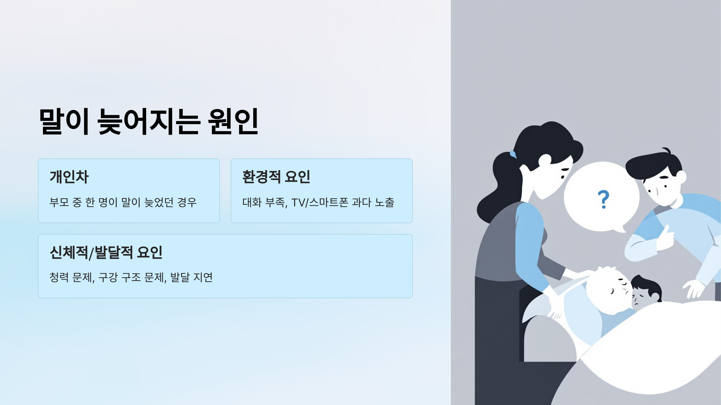 이 중 부모가 신경 써야 할 부분은 환경적인 요인! 아이가 충분한 언어 자극을 받을 수 있도록 도와주세요. 😊