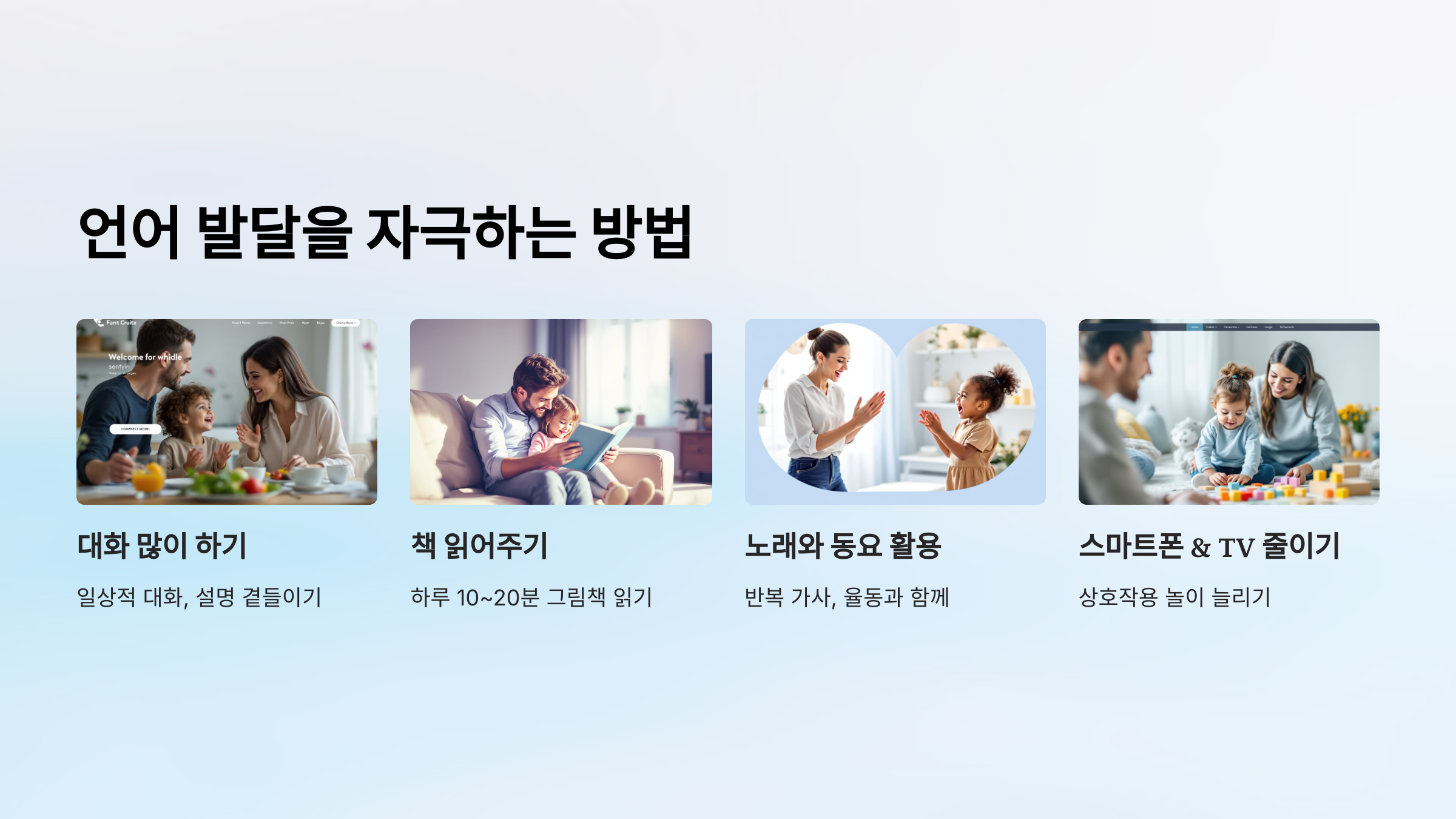 이 방법들을 꾸준히 실천하면 아이의 언어 발달에 큰 도움이 될 거예요! 😊