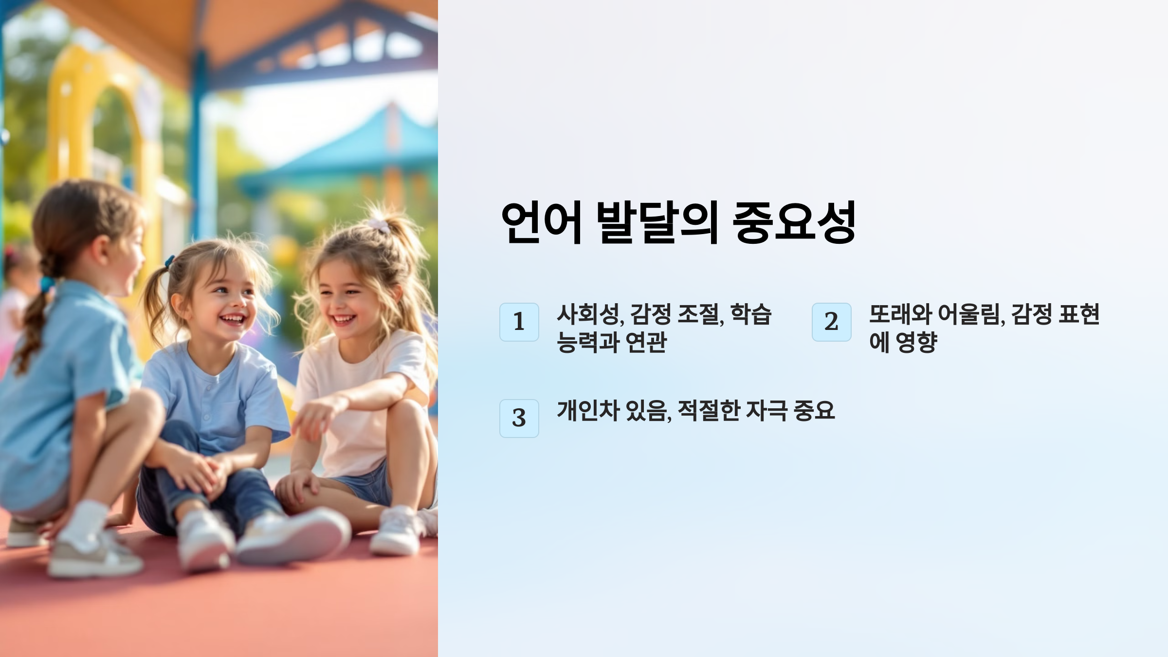 언어는 단순한 의사소통 수단이 아니라, 아이의 사회성, 감정 조절, 학습 능력과도 밀접한 관련이 있어요. 말이 느리면 또래 친구들과 어울리거나 감정을 표현하는 데 어려움을 겪을 수 있죠.