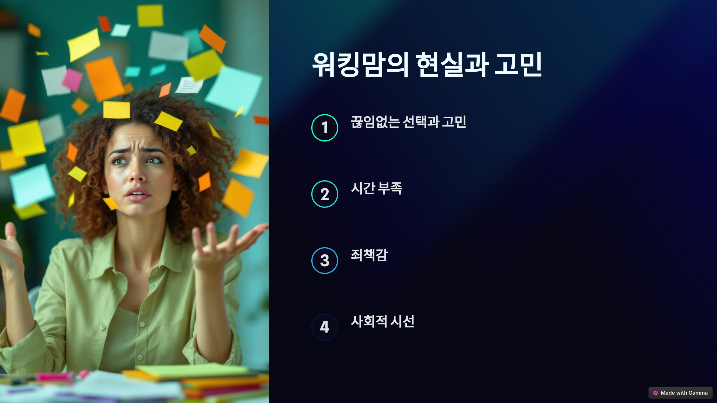 - 사회적 시선: 직장에서나 가정에서 서로 다른 기대에 부딪힐 때가 많습니다.