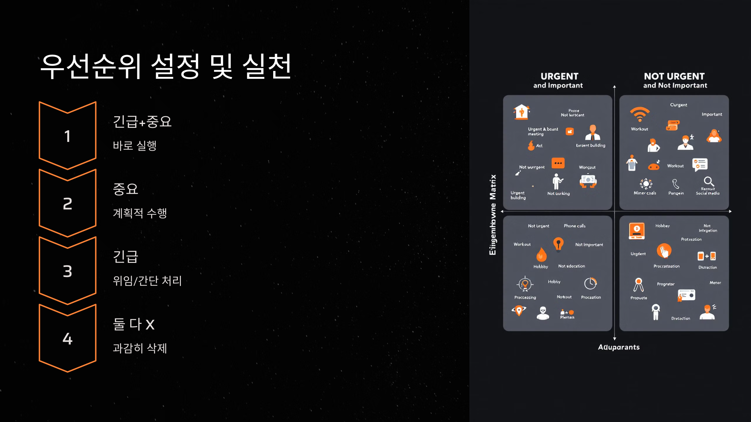 Eisenhower 매트릭스(긴급/중요 구분 매트릭스)를 활용해보세요.