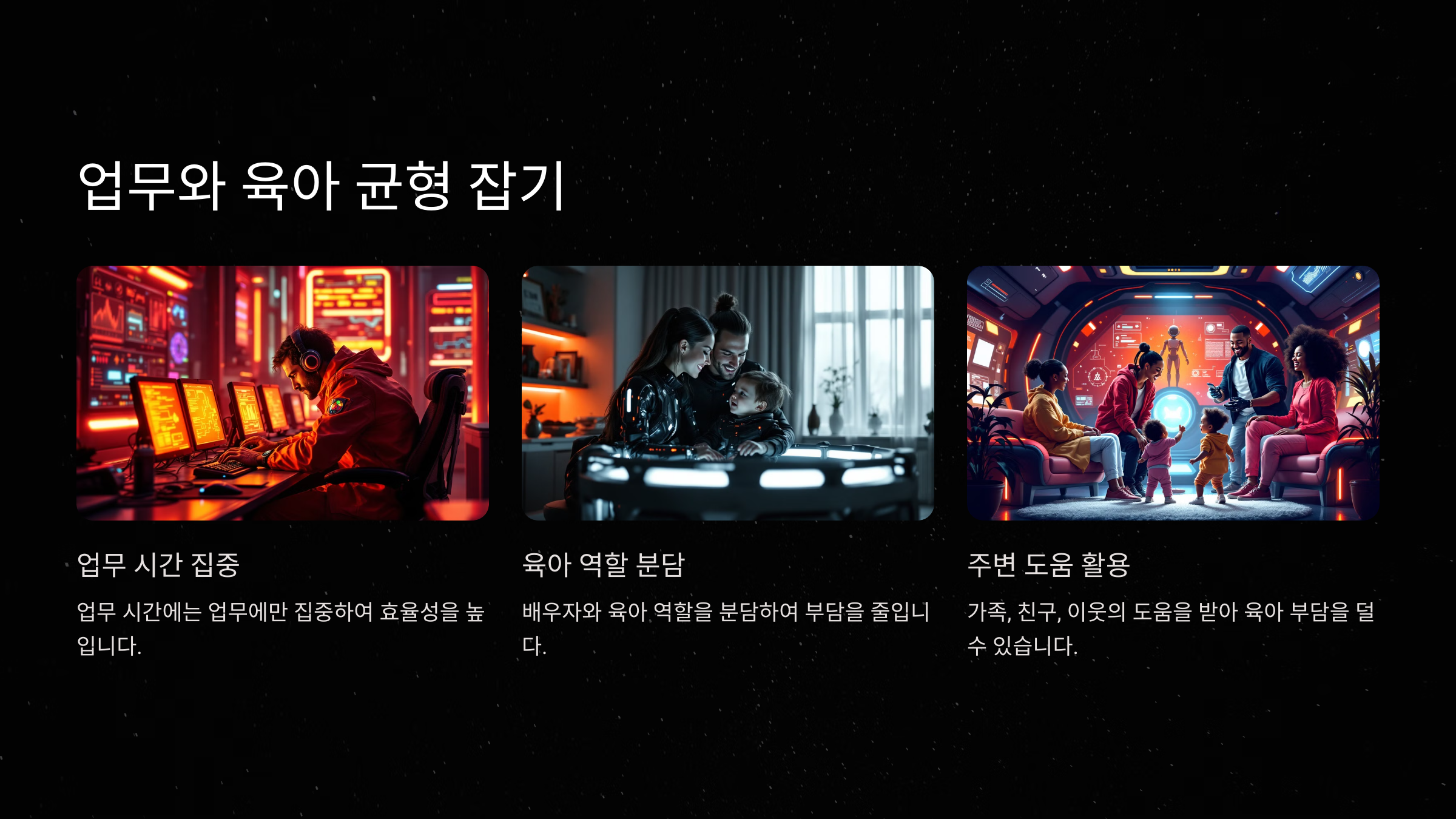 - 업무 시간과 육아 시간의 경계 설정: 업무 시간에는 일에 집중하고, 퇴근 후에는 최대한 육아에 집중하세요.