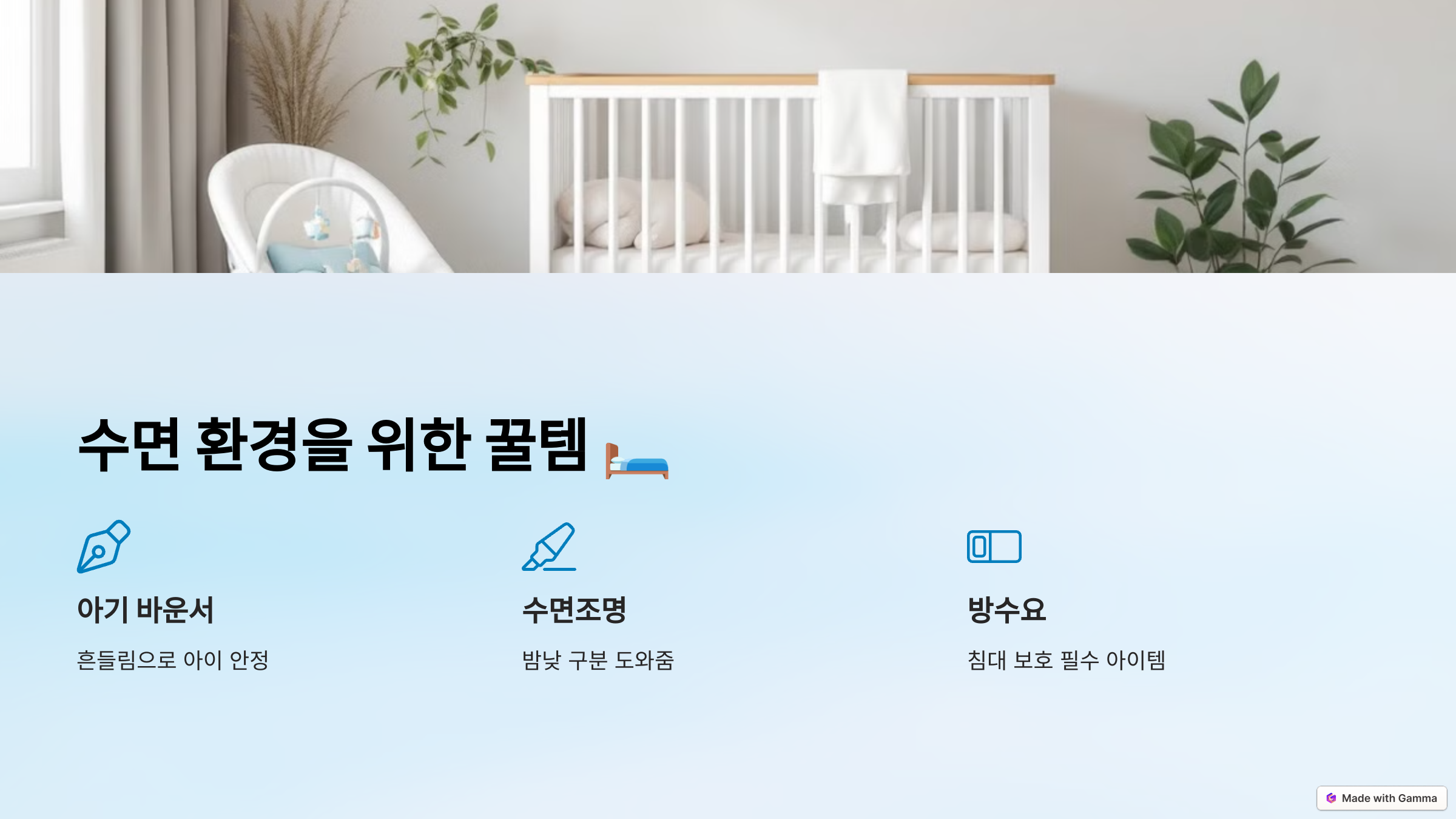 - 수면조명: 부드러운 빛으로 아이가 밤낮을 구분하도록 도와줘요.