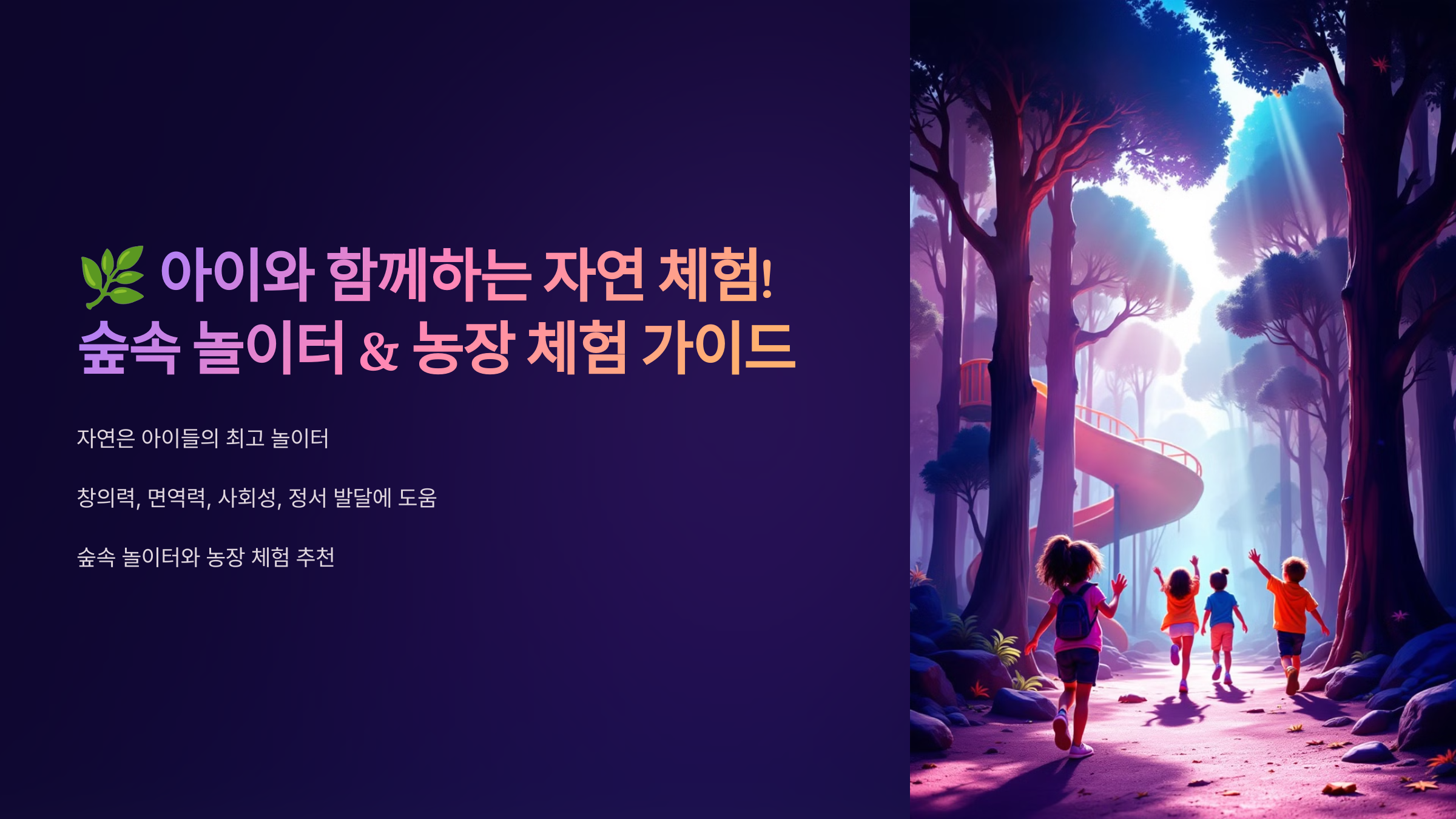 아이들에게 자연은 최고의 놀이터예요! 🌲 흙을 밟고, 동물을 만나고, 숲속에서 마음껏 뛰어노는 경험은 아이들의 성장과 정서 발달에 큰 도움이 돼요. 이번 글에서는 숲속 놀이터와 농장 체험을 제대로 즐길 수 있는 방법과 추천 장소를 소개해드릴게요! 😊