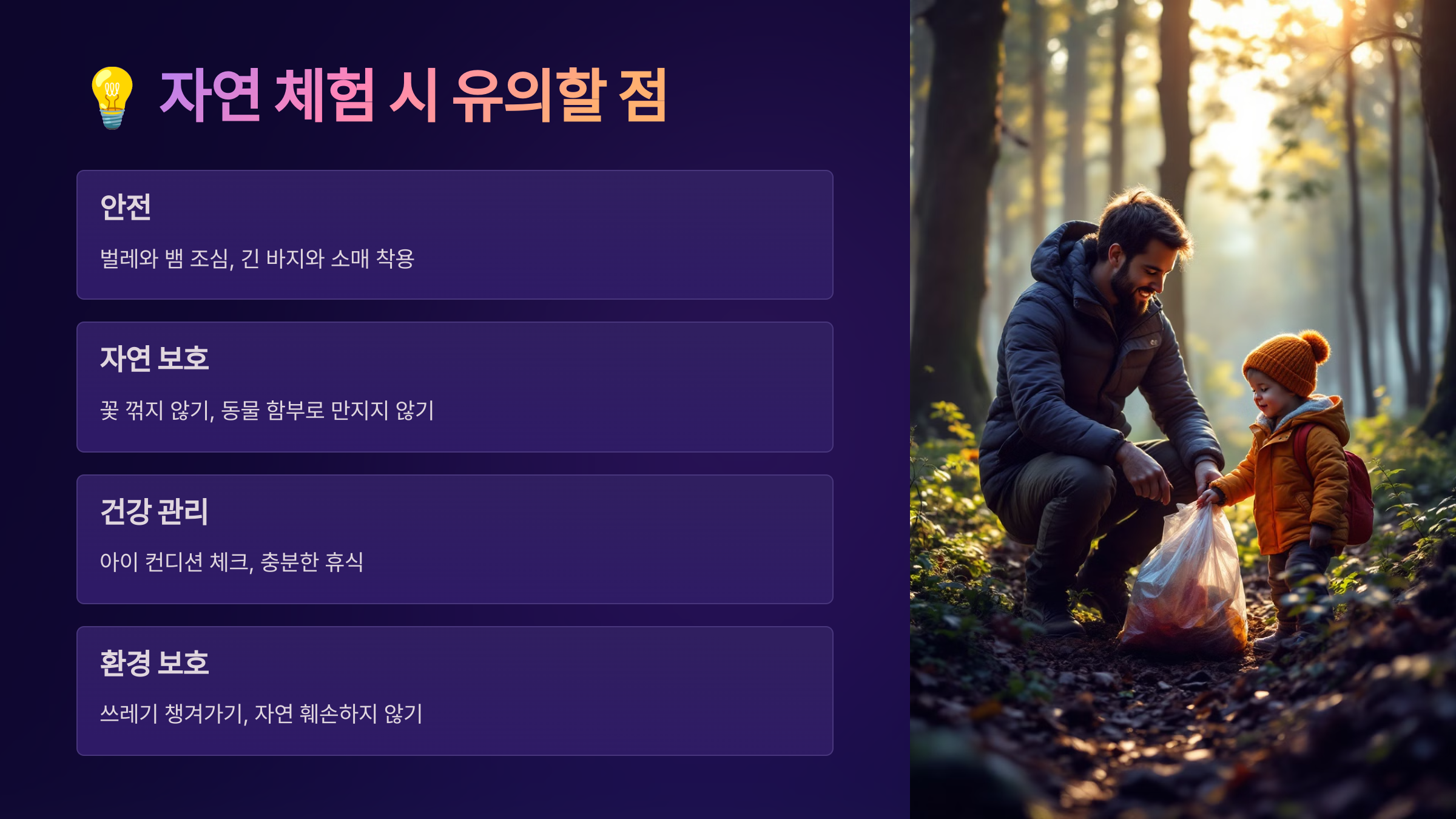 ✅ 자연을 해치지 않기: 꽃을 꺾거나 동물을 함부로 만지지 않도록 지도해 주세요.