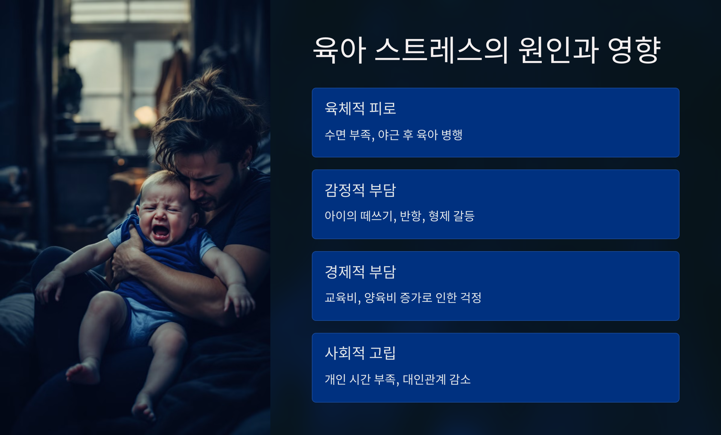 이러한 스트레스가 누적되면 부모의 우울감, 감정 폭발, 부부 갈등 증가, 아이와의 관계 악화로 이어질 수 있어요.